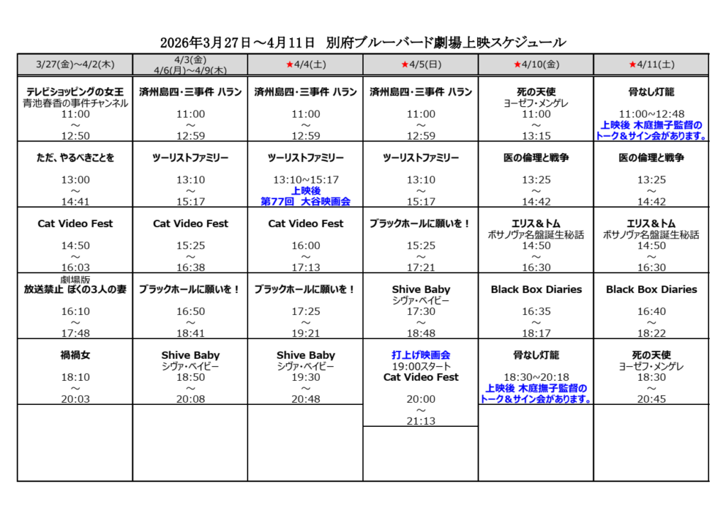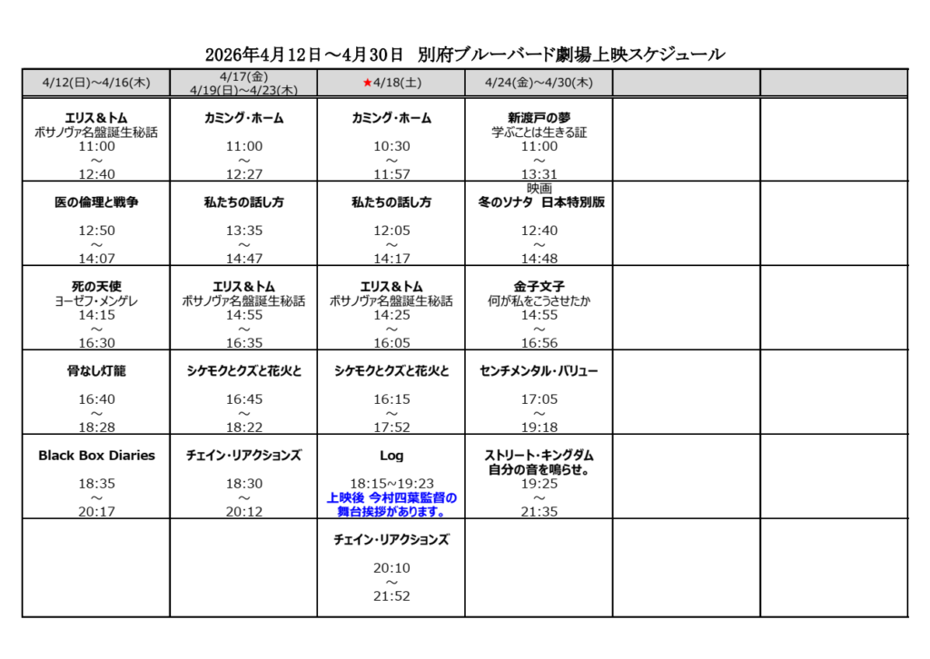 2026.03.27 2026年3月27日~4月23日 上映スケジュール ※都合により急遽プログラムの時間等が変更になる場合がありますので、新聞、HP等でご確認下さい。 ※当劇場は予告編の上映はございません。 上映開始時間になりましたら本編の上映が始まりますので、お気をつけてお越しくださいませ。 Tweet Share Hatena Pocket RSS feedly Pin it 金子文子 何が私をこうさせたか 前の記事 打上げ映画会 次の記事